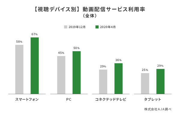 サイバーエージェント子会社のAJA(アジャ)は、「動画配信サービスの利用状況」に関するアンケート調査の結果を発表した。調査時期は4月22日・23日で、全国2万人以上が対象。2019年12月に行った同様の調査結果と比較を行っている。