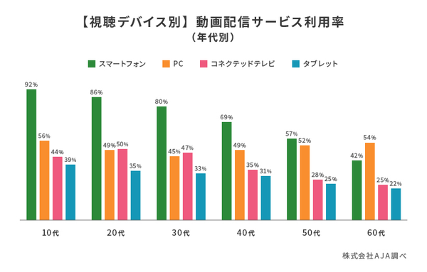 視聴デバイスの年代別では、10代~50代は「スマートフォン」がもっとも多いが、高齢層になるほど「PC」が増えており、60代では「PC」が逆転し最多となった。「コネクテッドテレビ」は20代が最多で、高齢層はそれほど多くない。特に20代・30代では、PCを抜き、スマートフォンに次ぐ視聴デバイスとなっている。