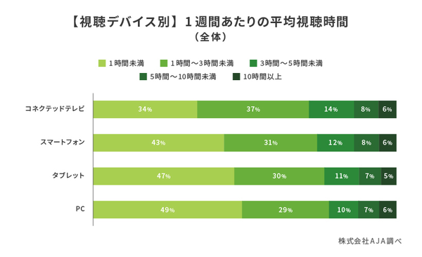 デバイス別の平均視聴時間を見ると、視聴時間が長いのは「コネクテッドテレビ」「スマートフォン」「テレビ」「PC」の順だった。