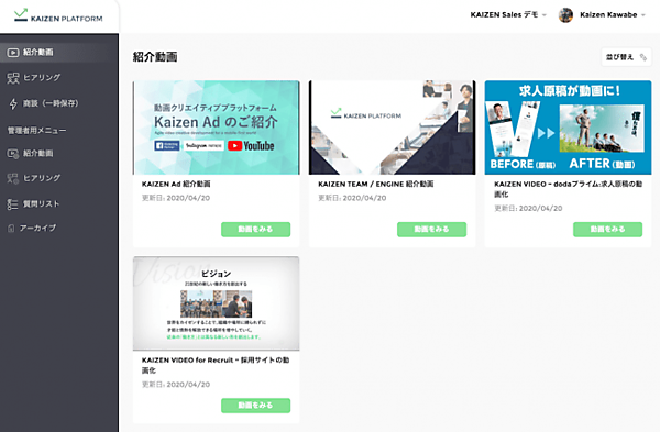 デジタルトランスフォーメーション(DX)=ITを活用した業務変革=支援プラットフォームサービス事業のKaizen Platformは、営業活動のDXをサポートする新たなサービス「KAIZEN Sales」を始めた、と5月12日発表した。動画とデータの活用で営業活動を可視化するクラウド型の営業向けCMS(コンテンツ管理システム)となる。