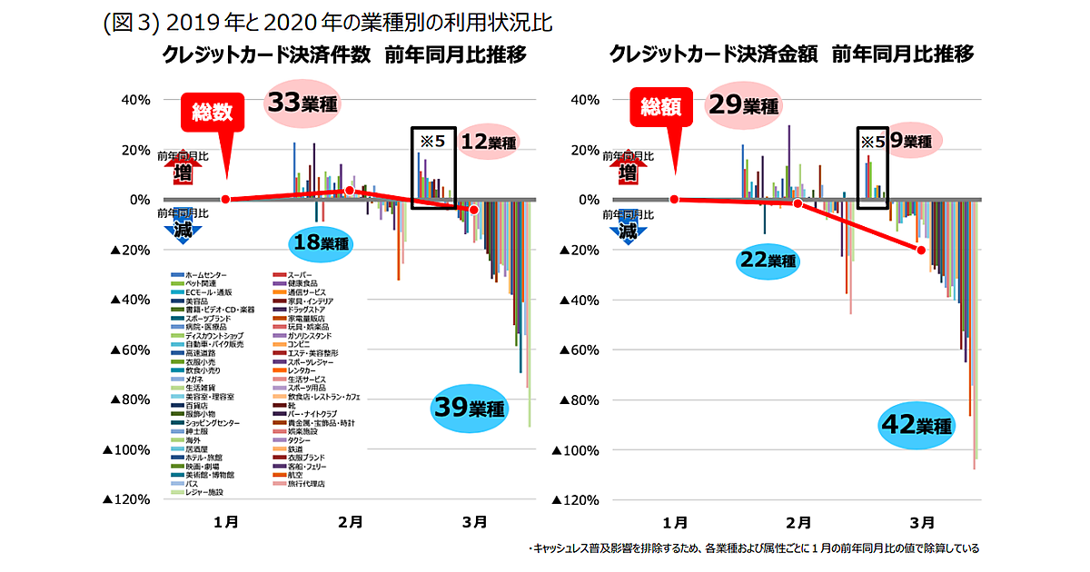 本来なら3月は決済が活発化するが、今年は前年よりも利用件数・利用金額が減少