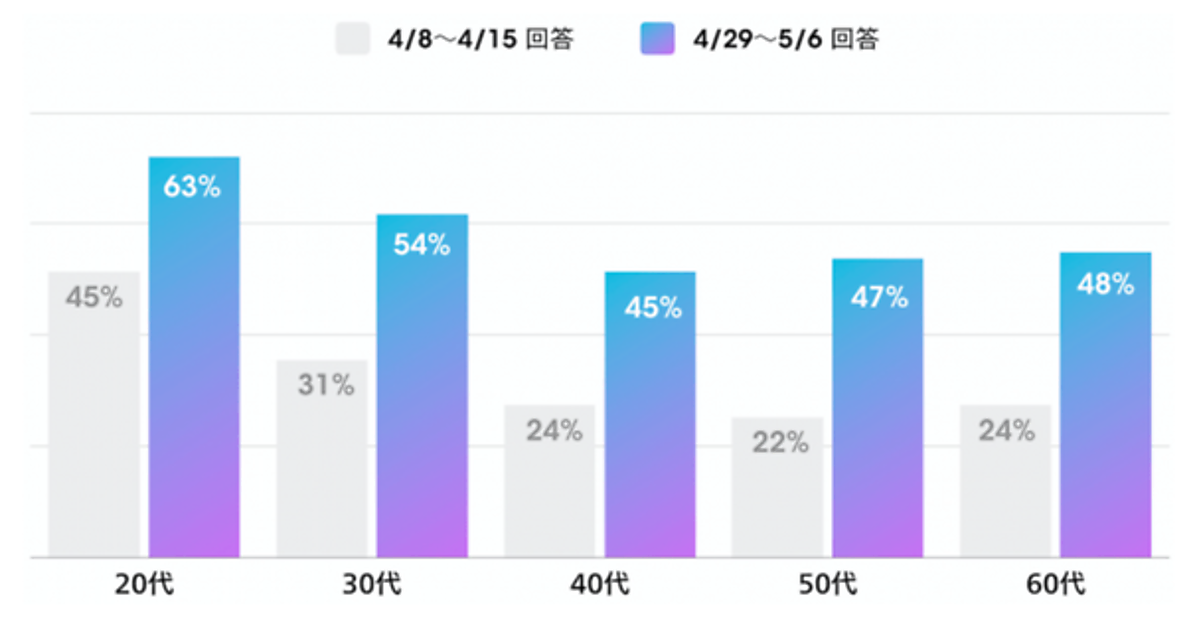 - 年代別回答の対象と期間:6,040名(2020年4月1日~4月8日)、5,328名(2020年4月29日~5月6日)