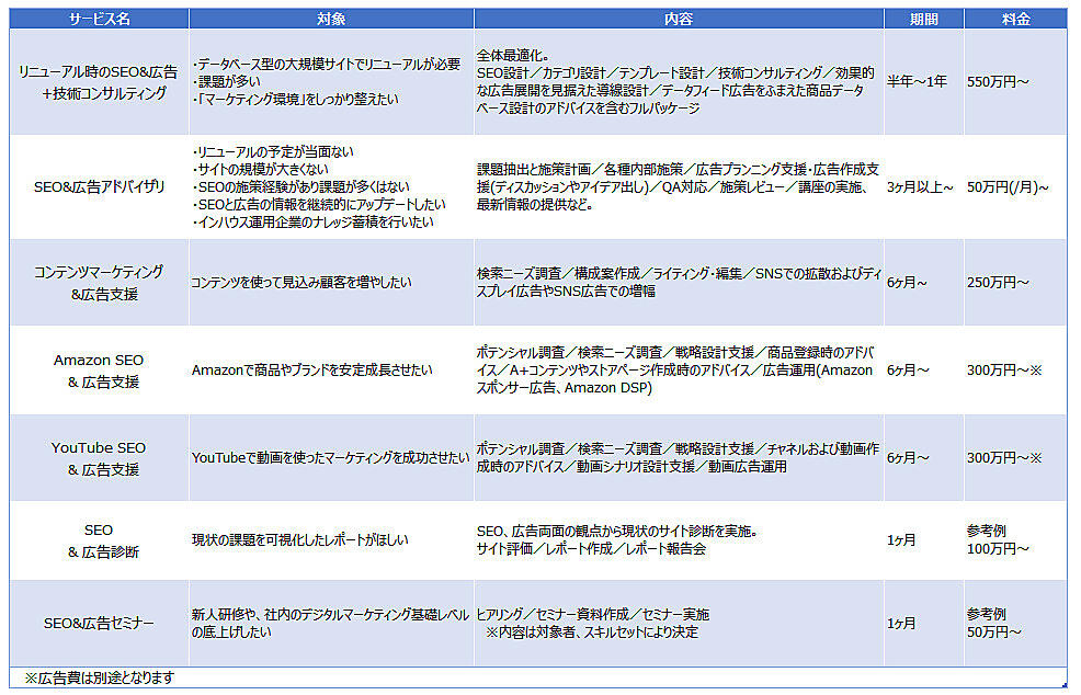 このサービスは、SEOと広告の専門家が長期的な事業の成長に向けたコンサルティングを実施。デジタルマーケティングに詳しいエンジニアが、複雑化するSEOと広告の高度な課題解決を助ける。ウェブサイトのリニューアルでマーケティング環境を整備したい企業や、社内にSEOと広告のチームを作りたい企業に適している。