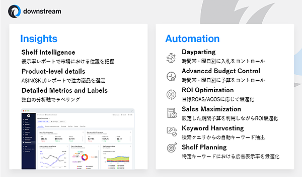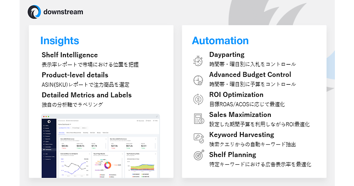 Downstreamは、セルフカスタマイズできるインサイトダッシュボード機能と、最新AI(人工知能)による自動最適化機能が特徴。CCIは独自機能も搭載した。企業はCCIを通じてDownstreamが活用可能になった。Downstream Impactは元Amazonのマーケティングマネジャーと同シニアエンジニアリングマネジャーが2017年に設立した。