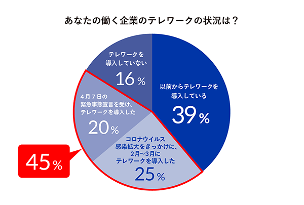 自身が働く企業のテレワークの現状を聞いたところ、45%が新型コロナウイルスの感染拡大をきっかけにテレワークを導入したことがわかった。