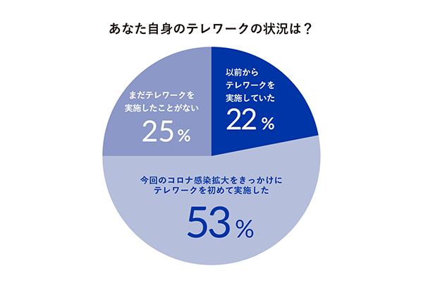 また、個人についても、今回のコロナ禍を機にテレワークを初めて実施した人が半数以上(53%)に上っている。