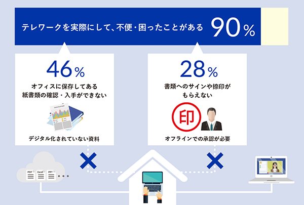テレワークで不便・困ったことがあるかを聞いたところ、不便・困ったことがある人は90%に。その理由として最も多かったのが、「オフィスに保存してある紙書類の確認・入手ができない」(46%)。次いで、「書類へのサインや捺印がもらえない」(28%)との回答が多く、紙・ハンコ業務がテレワーク遂行の妨げであることがわかった。