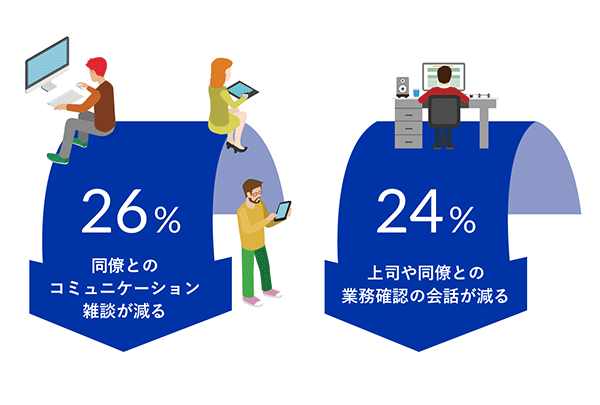 また、その他「同僚とのコミュニケーション・雑談が減る」(26%)、「上司や同僚との業務確認の会話が減る」(24%)との回答があった。