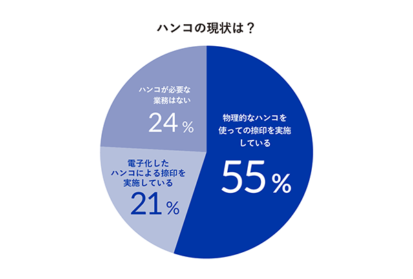 「紙とハンコ」が必要な業務の現状について聞いたところ、「物理的なハンコを使っての捺印を実施している」との回答は55%と半数を超えた。