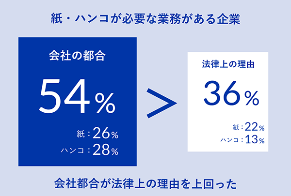 また、会社の都合による紙・ハンコ業務の割合は54%と、法律上の理由(36%)を上回った。