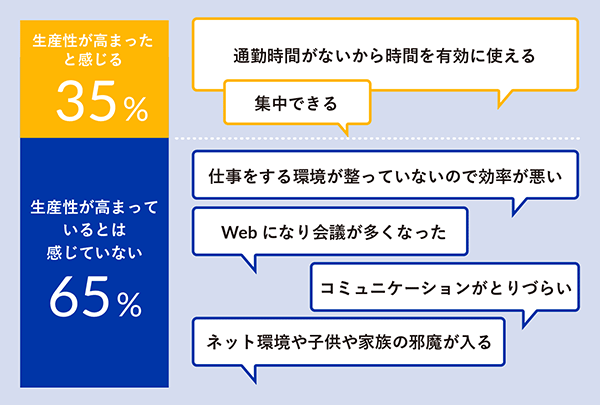 一方、「生産性が高まる」と回答した人は35%で、「通勤時間がないから時間を有効に使える」、「集中できる」という声が挙がった。