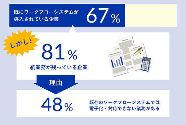 ワークフローシステムが導入されている企業は7割近い(67%)ものの、うち8割以上(81%)に紙業務が残っているという。