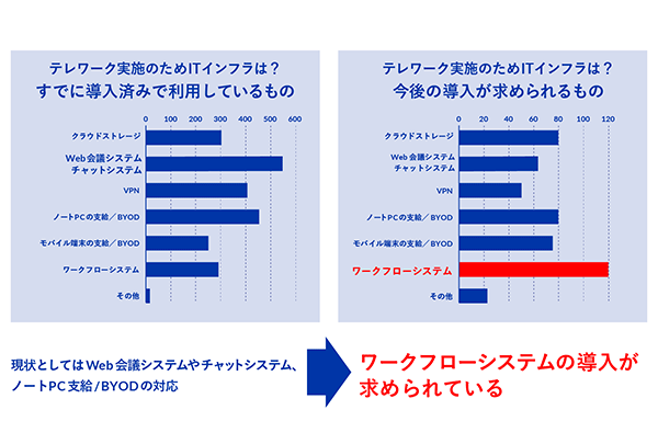 一方で、将来的には、ワークフローシステムの導入が最も求められている割合が高く、ペーパーレス化や業務フローの電子化・可視化がテレワーク遂行に求められていることも明らかになった。