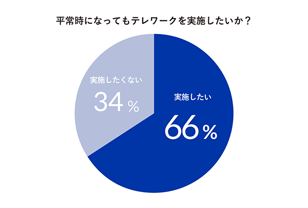 コロナウイルスの感染が終息して通常勤務に戻っても、テレワークを実施したいと回答した人は66%に上った。