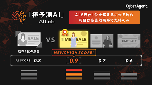 インターネット広告事業のサイバーエージェントは、AI(人工知能)を活用したプロセスで広告制作物を作り、広告効果があった場合だけ制作費が必要になるサービス「極予測AI(キワミヨソクエーアイ)」を始める、と5月15日発表した。広告配信効果を事前に予測する「効果予測AI」を開発した。広告制作をAIで大きく変えるという。