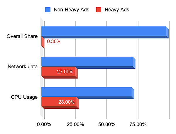 そこで同社は、広告が消費できるリソースに制限を設ける。具体的にはネットワークデータの場合で4MB、CPUの場合は30秒ごとの計測時間のうち15秒以上、または全体で60秒占有していた場合が該当するが、現時点でこの基準に該当する広告は全体の0.3%に過ぎない。それでも、これらの広告が消費するネットワークデータは全体の27%、CPU使用率の28%に上るという。
