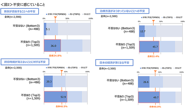 「不安に感じること」を聞くと、「家族が感染すること」「治療法が見つかっていないこと」「終息時期が見えないこと」「日本の経済が悪くなること」に対しての不安が高かった。なおポイント差で見ると、「治療法が見つかっていないこと」33.0ポイント、「終息時期が見えないこと」32.6ポイント、「家族が感染すること」30.9ポイント、「日本の経済が悪くなること」23.1ポイントと、不安を感じている人・いない人で、認識にかなりの差が見られた。