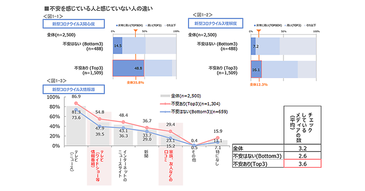 まず「新型コロナウイルスへの関心」「新型コロナウイルスの理解」「新型コロナウイルスの情報源」「チェックしている情報源(メディア)の数」などを聞くと、“不安を感じている”とした人ほどニュースへの関心度が高く、チェックしているメディアの数が多かった。情報源では「ワイドショーなどの情報番組」「クチコミ」が、“不安は感じていない”とした人よりも相対的に高かった。