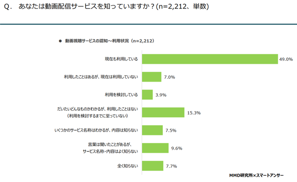 まず動画視聴サービスについて聞くと、「現在も利用している」49.0%が最多。以下「だいたいどんなものかわかるが、利用したことはない」15.3%、「言葉は聞いたことがあるが、サービス名称・内容はよく知らない」9.6%が上位だった。利用している層と利用していない層がかなり分かれている様子がうかがえる。