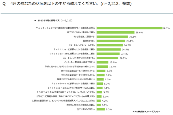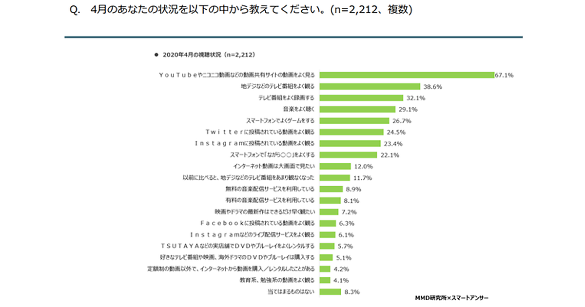 4月のエンタメ視聴、YouTubeやニコニコ動画がよく見られていた