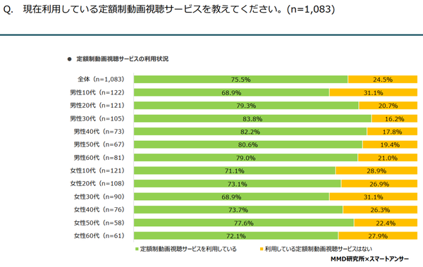 続いて、動画視聴サービス利用者(n=1,083)を対象に、「定額制動画視聴サービスの利用状況」について聞くと、全体では「定額制動画視聴サービスを利用している」が75.5%、「利用している定額制動画視聴サービスはない」が24.5%となった。性年代別では、男性の利用最多は30代(83.8%)、女性の利用最多は50代(77.6%)だった。なお、月額での定額制動画視聴サービスの利用者(n=562)を対象に、「利用している定額制動画視聴サービス」(複数回答可)を聞くと、「Amazon Prime Video」54.4%、「Netflix」19.0%、「Hulu」13.2%が上位だった。
