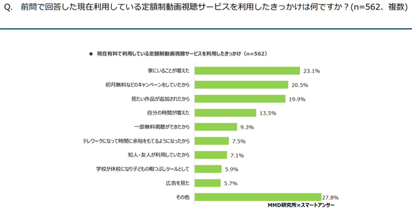あわせてこの人たちに「利用したきっかけ」を聞くと、「家にいることが増えた」23.1%が最多で、以下「初月無料などのキャンペーンをしていたから」20.5%、「見たい作品が追加されたから」19.9%が上位となった。