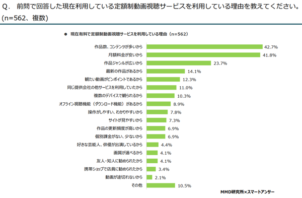 続いて、「利用している理由」を聞くと、「作品数、コンテンツが多いから」42.7%が最多で、以下「月額料金が安いから」41.8%、「作品ジャンルが広いから」23.7%が続いた。