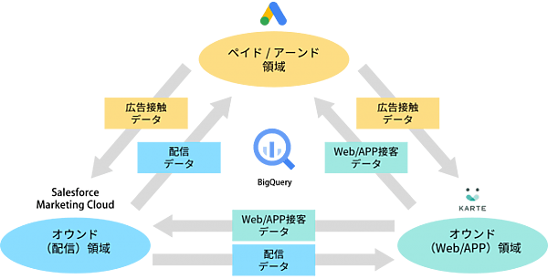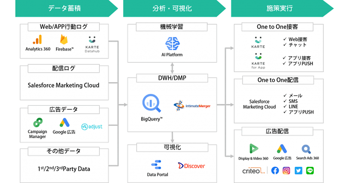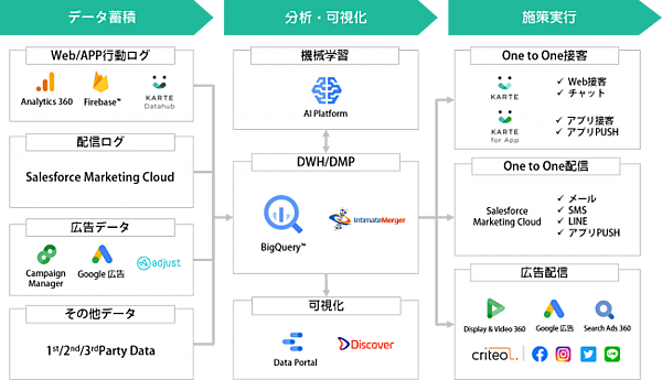 これらのSaaS製品を組み合わせ、ユーザーに一貫した顧客体験を提供するOne to Oneマーケティング(顧客それぞれの好みや属性に応じたマーケティング)プラットフォームの構築、運用を一括支援。広告データ、サイトの行動ログ、CRM(顧客関係管理)データの蓄積・統合から、分析・可視化、施策実行・改善までを可能にする。