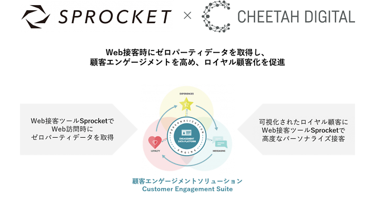 チーターデジタルのマーケティングプラットフォーム「Cheetah Digital Customer Engagement Suite」と、Sprocketのウェブ接客プラットフォーム「Sprocket(スプロケット)」を連携。ウェブ行動・接客データを使ったパーソナライゼーションや、ロイヤルティ(信頼・忠誠心)マーケティングの高度化サービスを共同で展開する。