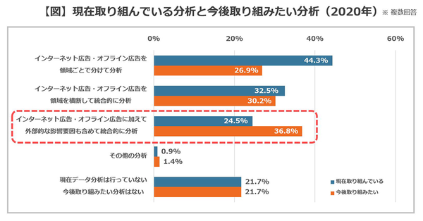 一方「今後取り組みたい分析」では、「インターネット広告・オフライン広告に加えて外部的な影響要因も含めた統合的な分析」36.8%が最多。こちらでも「ニーズは高いが、実践はできていない」というギャップが見える。