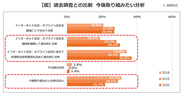 さらに同じく、「今後取り組みたい分析」について過去調査結果との比較を行うと、「インターネット広告・オフライン広告に加えて外部的な影響要因も含めた統合的な分析」36.8%がさらに数値を伸ばしている。「インターネット広告・オフライン広告を、領域横断して統合的に分析」30.2%も高い。領域横断的な分析に対するニーズがうかがえる。