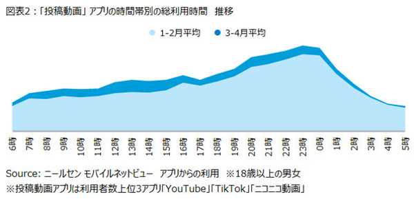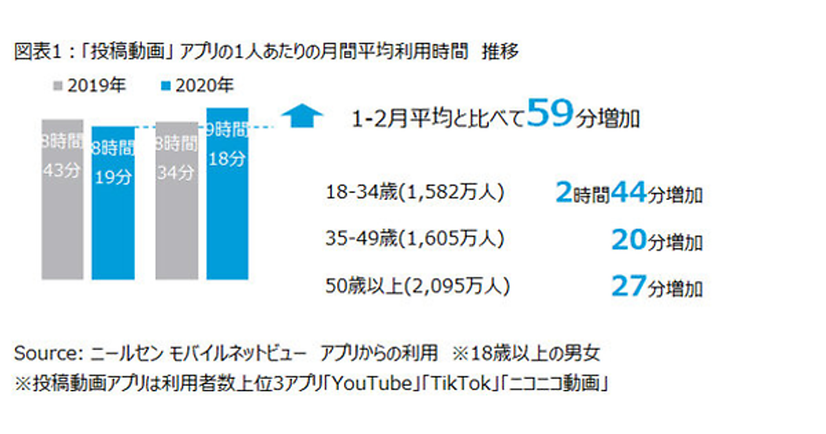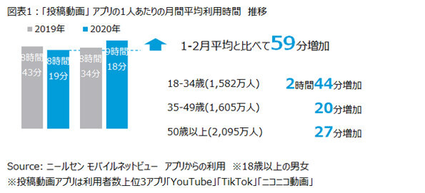 3~4月に「投稿動画」の視聴が拡大、若年層は2時間以上も増加