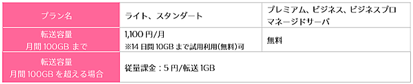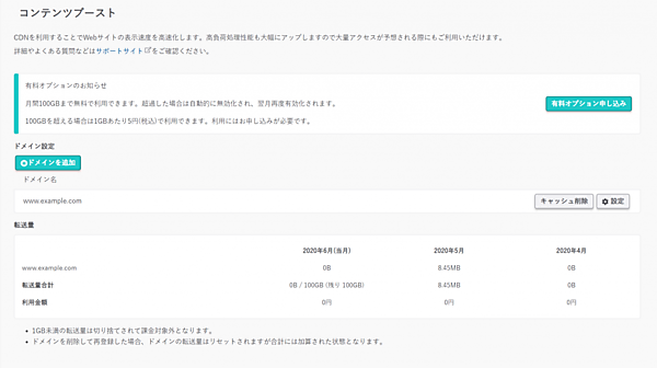 コンテンツブーストではCDNを経由するので、アクセスが集中してサイトが表示されない状態を回避できる。料金は「ライト」と「スタンダード」プランが月間転送容量100GBまで1100円で、「プレミアム」「ビジネス」「ビジネスプロ」「マネージドサーバ」プランは無料。月間100GBを超える場合はどのプランも従量課金になり転送1GBにつき5円。
