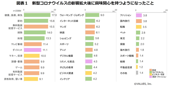 まず「新型コロナウイルスの影響拡大後に、興味関心を持つようになったこと」を聞くと、「健康、医療、病気」17.0%、「節約」15.6%、「無料動画配信サービス」15.5%、「掃除」14.0%、「料理」13.3%が上位だった。幅広い意見があがったが、やはり自分や家族の健康状態が最優先のようだ。動画視聴、掃除・料理などの内向き志向も強い。