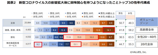 「健康、医療、病気」「節約」「無料動画配信サービス」のトップ3項目について性年代別に見ると、「健康、医療、病気」は60歳以上、「節約」は女性20~40代、「無料動画配信サービス」は20代が、他層に比べて多い。