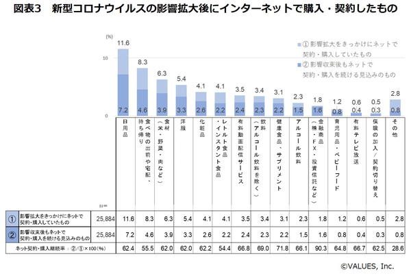 次に、「新型コロナウイルスの影響拡大後に、インターネットで購入・契約したもの」を聞くと、「日用品」11.6%、「食べ物の出前や宅配、持ち帰り」8.3%、「食材〈米・野菜・肉など〉」6.3%が上位で、外出自粛や三密回避の影響が見える。あわせて「影響収束後もネットで契約・購入を続ける見込みのもの」を聞いているが、いずれの商品も、引き続きネット購入を続ける意向が強い。