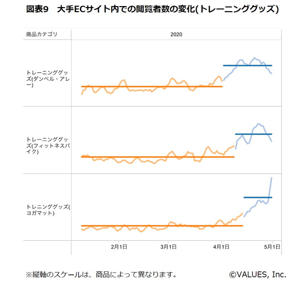 一方、ダンベル・アレー、フィットネスバイク、ヨガマットなど「大手ECサイトにおけるトレーニンググッズの閲覧数」を見ると、緊急事態宣言が発令された4月7日以降、閲覧者数が急増している。「家で行うことができる運動」の具体的アイテムとして閲覧されているようだ。