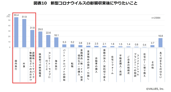 さらに「新型コロナウイルスの影響収束後にやりたいこと」を聞くと、「国内旅行」55.4%、「外食」51.9%、「遊園地・テーマパーク・動物園などへのお出かけ」31.8%が上位。一方で、収束が見えない「海外旅行」18.1%、「コンサート・ライブに行くこと」22.6%などは、まだ数値が低かった。