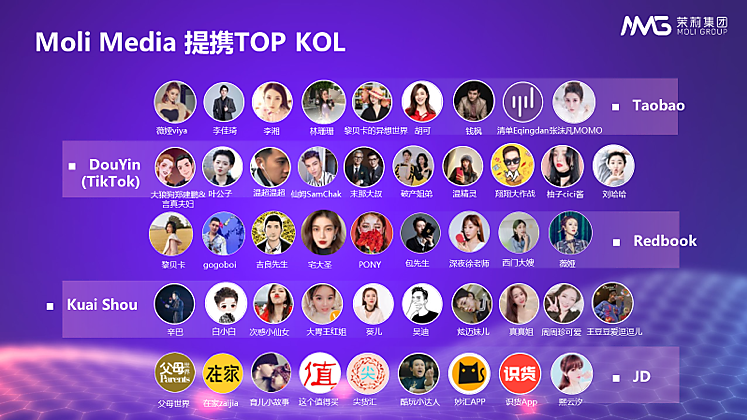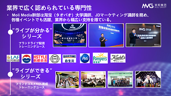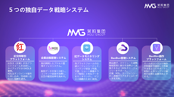 Moli Mediaは、3000以上の有名ブランドの中国ECでの統合型マーケティングを支援。中国のECサイトが大規模セールを実施する2019年のW11(独身の日)で10億元(約150億円)以上売り上げたブランドの5割が支援を受けた。中国主要プラットフォームでのKOL(キーオピニオンリーダー)ネットワークは同国最大級という。