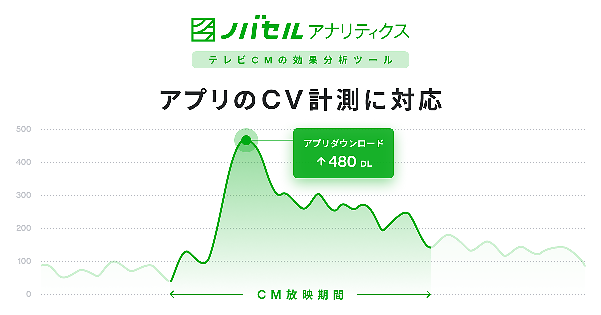 印刷サービス・広告プラットフォーム事業のラクスルは、同プラットフォーム「ノバセル」で提供するクラウド型のテレビCM効果測定ツール「ノバセルアナリティクス」が、スマートフォンアプリのダウンロード計測に対応した、と6月11日発表した。テレビCMでのコンバージョン(最終成果)が分かり、効果が可視化できる。
