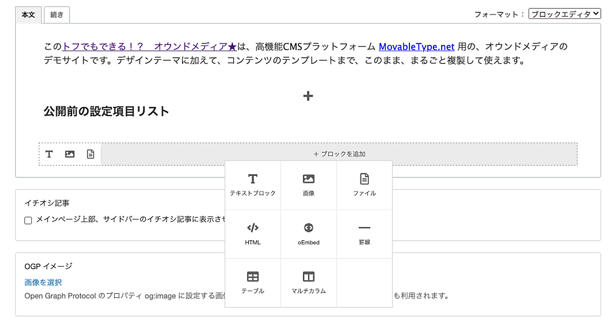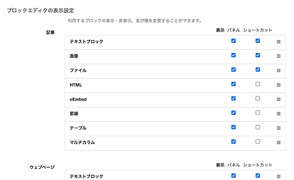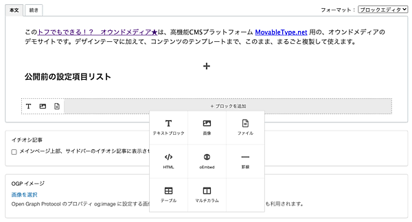 記事やWebページのコンテンツ作成で、見出し▽テキスト▽表組み▽画像▽埋め込み動画▽マルチカラム(2列、3列、4列)といったブロックを組み合わせて編集できる。運用担当者ができるだけ「WYSIWYG(見たまま)」で多彩なコンテンツのページを作成できるよう設計した。ブロックの順番はドラッグ&ドロップや矢印ボタンで自由に並べ替えられる。