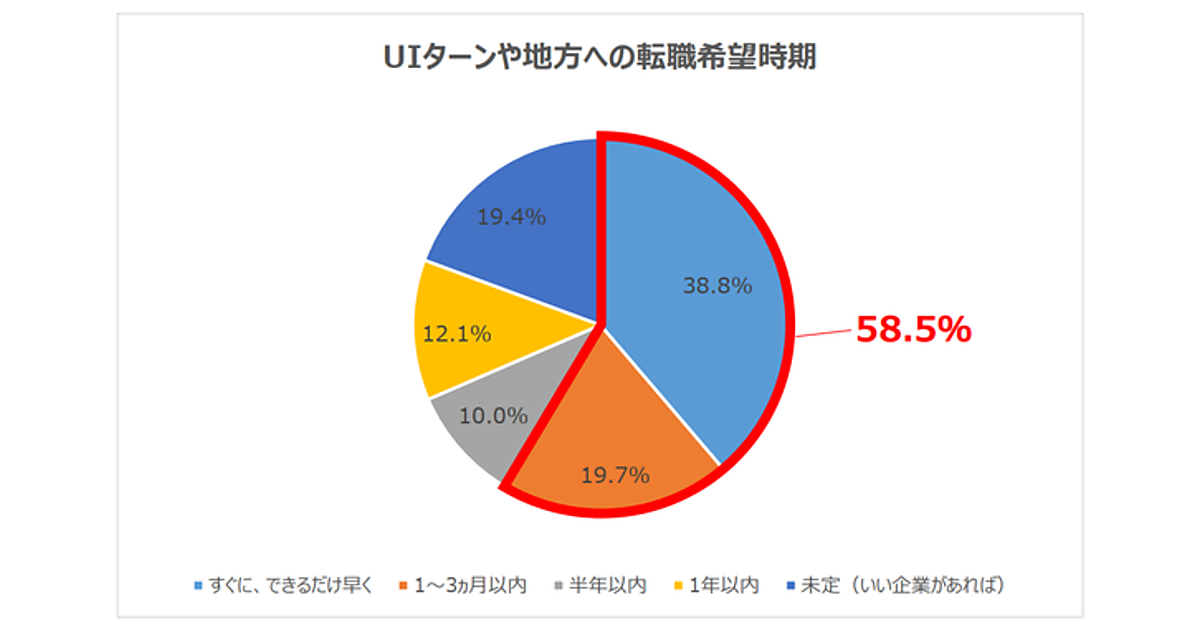 「UIターン・地方への転職の希望時期」を聞くと、「すぐに、できるだけ早く」がもっとも多く38.8%、「1~3か月以内」19.7%と合わせて、58.5%が“3か月以内のUIターン転職”を希望していた。