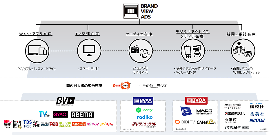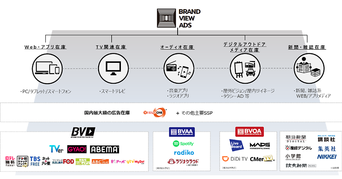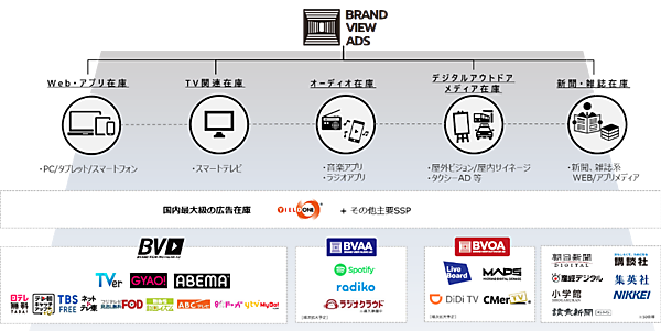 デジタル広告にはリアルタイムに広告枠を自動買い付けするプログラマティック広告の仕組みが導入されているが、日本ではパソコンやスマートフォンなどデジタル機器への配信が中心だった。そのためBRAND VIEW ADSを開発。スクリーン・フォーマットにとらわれることなく、付加価値の高いさまざまな媒体への横断配信を実現する。