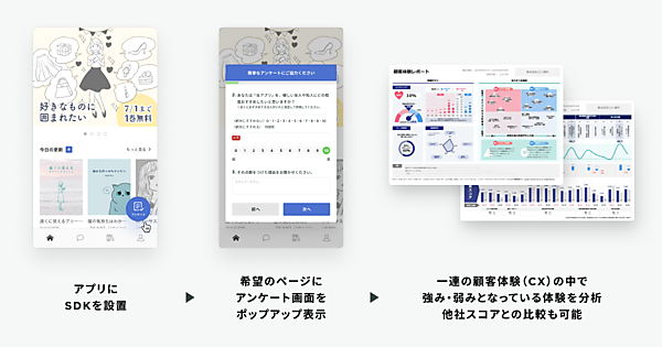 アプリのユーザーが簡易なアンケートに回答すると、レポートを作成するための情報が得られる。レポートでは顧客がどの体験が魅力的でアプリを使い続けるのかや、どの体験が不満かが特定できるほか、他社の平均データと比べた自社サービスの強み、弱さが容易に把握可能になる。8月末までの申し込みに限定して無料で提供する。