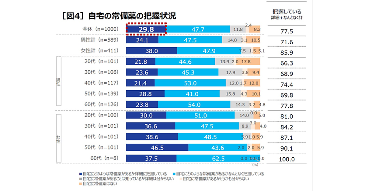ここで「自宅の常備薬」について聞くと、「きちんと把握している」という人は全体の29.8%、「なんとなく把握している」47.7%、「ない」8.3%などとなった。性年代別で見ると、男性は女性に比べ常備薬について把握しておらず、特に20代男性は、17.8%が「自宅に常備薬はない」と回答している。