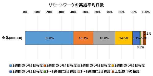 次に、週5日勤務とした場合「リモートワークを実施した平均日数」を聞くと、「1週間のうち5日程度」39.8%が最多。「1週間のうち3日程度」18.0%、「1週間のうち4日程度」16.7%で、テレワークに振り切っている人たちが多数派だった。