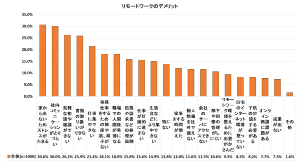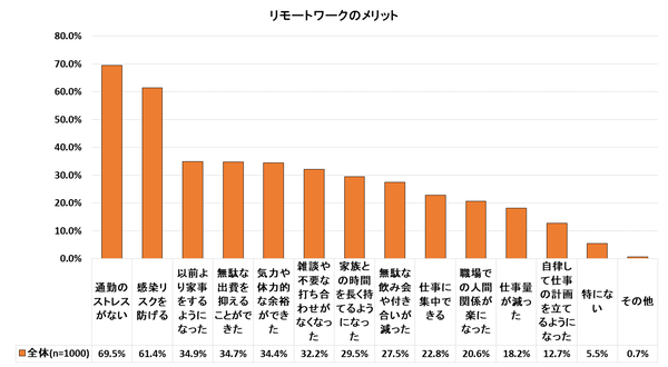 「リモートワークのメリット/デメリット」を聞くと、メリットでは「通勤のストレスがない」69.5%、「感染リスクを防げる」61.4%、「以前より家事をするようになった」34.9%が上位。デメリットでは「家から出ないためストレスがたまる」30.6%、「社内コミュニケーションがとりづらい」30.0%、「気軽な相談や雑談ができない」26.2%が上位となっており、コロナ拡大抑止という本来の目的では無く、通勤やコミュニケーションなど、勤務様式や生活様式の変化に関心が集まった。