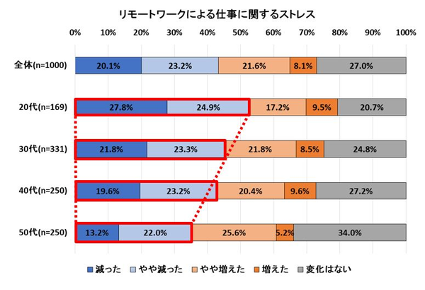 そこで「ストレス」に焦点を当てて質問したところ、ストレスが「減った」「やや減った」との回答は、「20代」52.7%、「30代」45.0%、「40代」42.8%、「50代」35.2%で、若年層ほどストレスの減少度が高い。