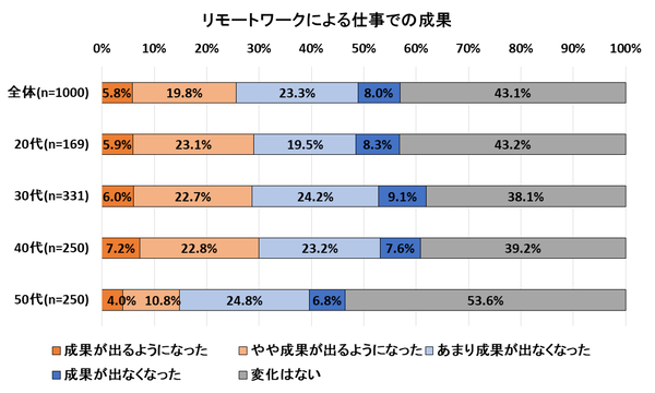 リモートワークによる仕事の成果、50代は「変化はない」との回答が多数