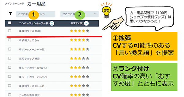 CV確率の高い「おすすめ度」も表示し、施策優先度の判断の参考にできる。SEO担当者は経験則でキーワードを探すとよく使われるビッグワードになりがちで、新たなキーワード発掘に苦戦している。新機能ではCVや売上につながる検索回数の多いキーワードから言い換え語も含めて提案するので、キーワード選定の時間短縮など効率化に役立てられる。
